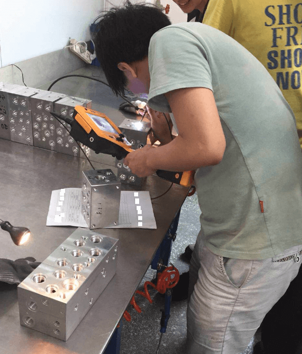 某企業人員用古安泰工業內窺鏡C50進行液壓閥塊檢測