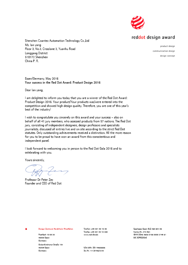在今天,古安泰又收到紅點獎的創始人兼首席執行官Peter Zec從大洋彼岸發給我們的郵件,古安泰很榮幸受邀參加位于德國的紅點獎頒獎晚宴,紅點獎頒獎晚宴堪稱國際設計界年度最受矚目的大事件,這次晚宴也會將2016年紅點獎熱潮推向巔峰。