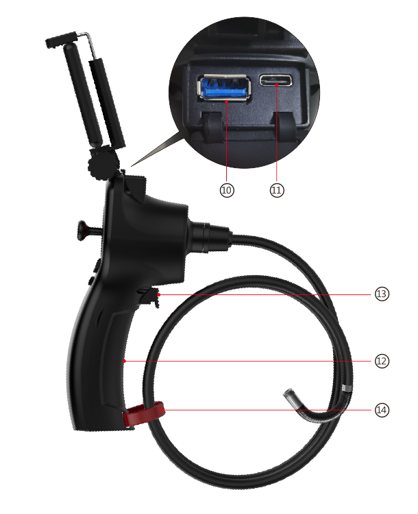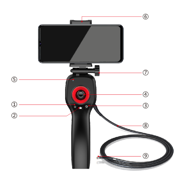 ①電源開關鍵 ②錄像鍵 ③照明亮度調節鍵 ④搖桿 ⑤指示燈 ⑥手機夾⑦角度調節旋鈕⑧管線 ⑨探頭 ⑩USB2.0 ?Type C接口 ?電池倉?拍照鍵 ?管線收納