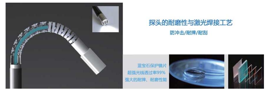 2、插入管的探頭部分使用具有高度耐磨性能的鈦合金,耐磨強度是普通不銹鋼的100倍,為了進一步保護鈦合金探頭,采用了藍寶石保護鏡片,它的強度是普通石英石鏡片的8倍,鋼化玻璃的20倍,有效避免被檢設備的二次破壞。