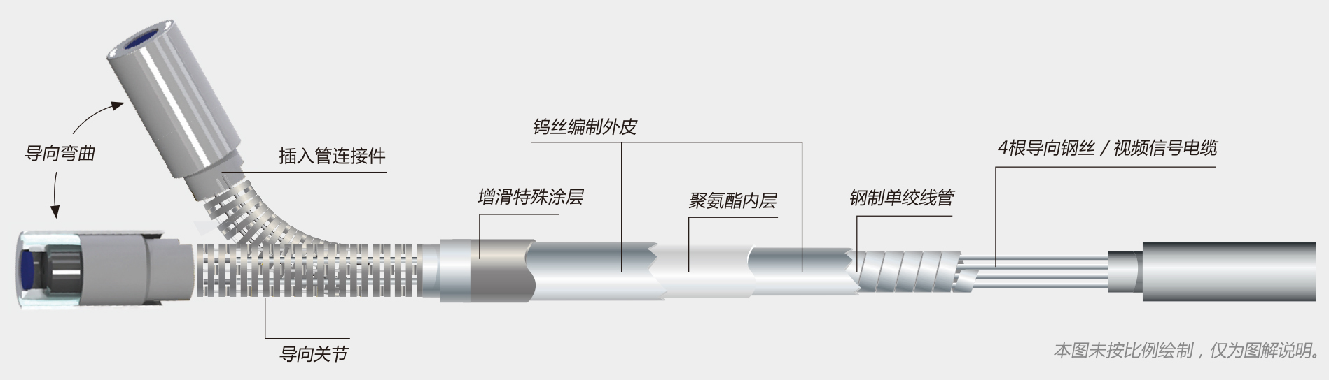 內窺鏡探頭前端攝像頭采用藍寶石保護鏡片更耐磨,在檢測較為粗糙的零部件內部時,如汽車壓鑄類零部件,液壓閥塊等等,能夠減輕磨損程度,延長鏡頭的使用壽命。探頭可彎曲的部分為多節導向關節組成的特殊結構,由鋼絲繩進行牽引,可進行360°全方位轉向彎曲,操作靈活,無觀測盲區。管線外部采用鎢絲網編織層,其特點是耐高溫,耐酸堿腐蝕,更為耐磨,防水防油,可在較為惡劣的環境中進行檢測。用戶可根據需要定制不同規格內窺鏡插入管線,不同的景深、長度、直徑管線,可以適應不同的工作場景。探頭還配備了亮度多級可調的前端LED導光或后置LED光纖導光系統,為檢測工作提供了更為充足的照明光源,能夠應用于各種黑暗、彎曲的工作環境,如觀察管道內壁的銹蝕、焊縫缺陷等等。
