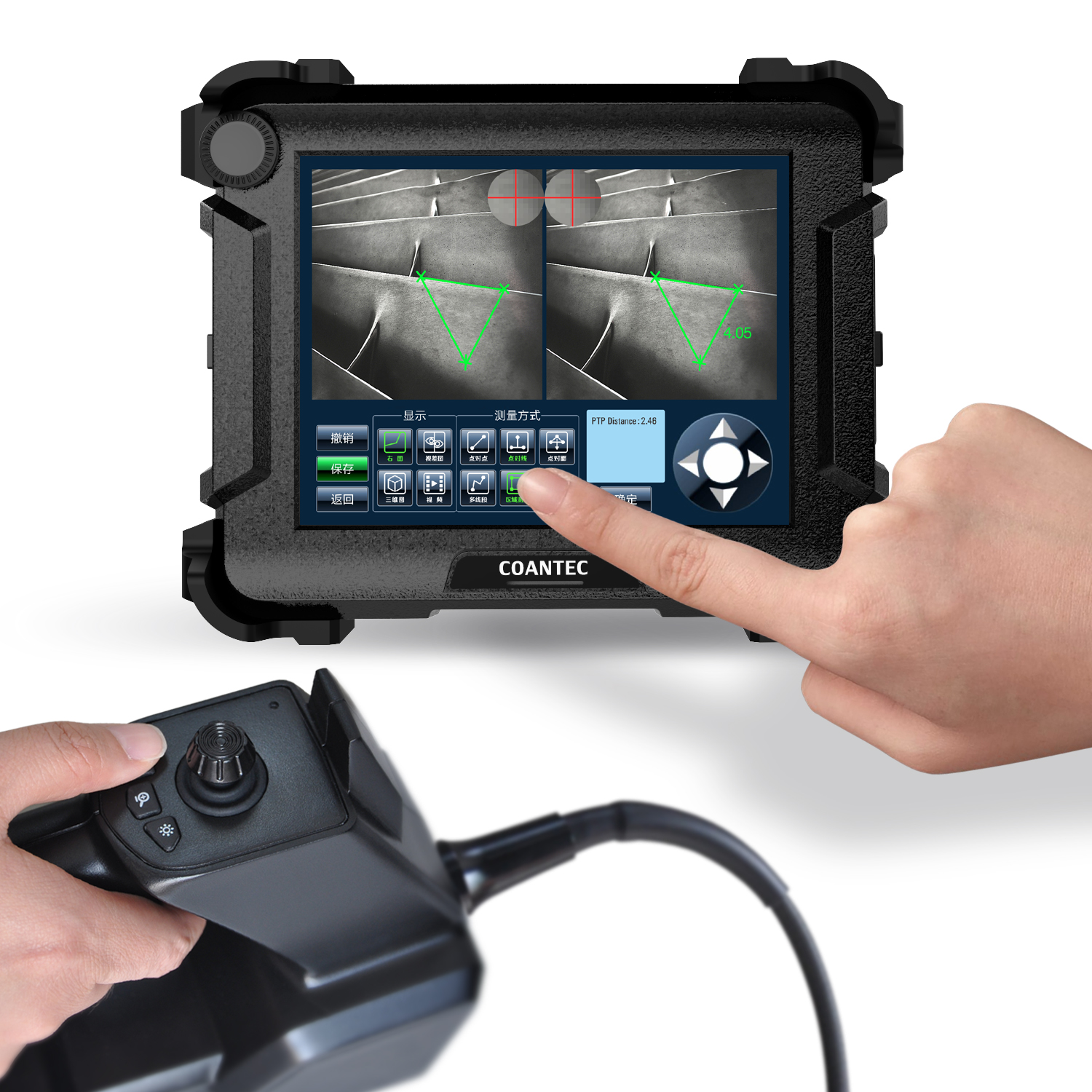 古安泰工業內窺鏡目前型號有C40、C50、C60常規系列,C68、C65以及X3、X5新品多功能系列。根據操作方式,可分為臺式和手持式。整機采用一體化人體工學設計,操作更為舒適。內窺鏡管徑1.8-8mm、長度1-10m、景深多種規格可選,觀測方向可根據需要選擇直視/側視鏡頭,此外還可以根據需要選擇近焦、遠焦等各種不同規格鏡頭。探頭可360°全方位導向探頭,可全面無死角地迅速觀測到管道內腔狀態和表面情況,清晰呈現缺陷狀態。特別設計的四層鎢絲編織管,鎢絲編制外層更耐磨,能夠有效保護管線,使用壽命長。管線柔韌性好,可在管道內連續多個轉彎,有著更遠的觀測距離。光纖導光/前置LED導光可選。后置光纖導光照明效果更好,照度最高可達10萬Lx,同時減少發熱以及可能對探頭壽命帶來的不良影響。軟件搭載多種功能,如安全密碼鎖,支持負片/圖像翻轉/圖像放大,輔助測量參考線功能,添加備注和水印等功能,實時檢測圖像多倍放大功能,使用更為便捷,適用性更強。高靈敏度圖像傳感器,呈現更為流暢的圖像。三維測量功能可測量點對點、點對線、點對面距離,面積大小、多線段長度等等,可對缺陷實現精確到0.01mm的測量數據。